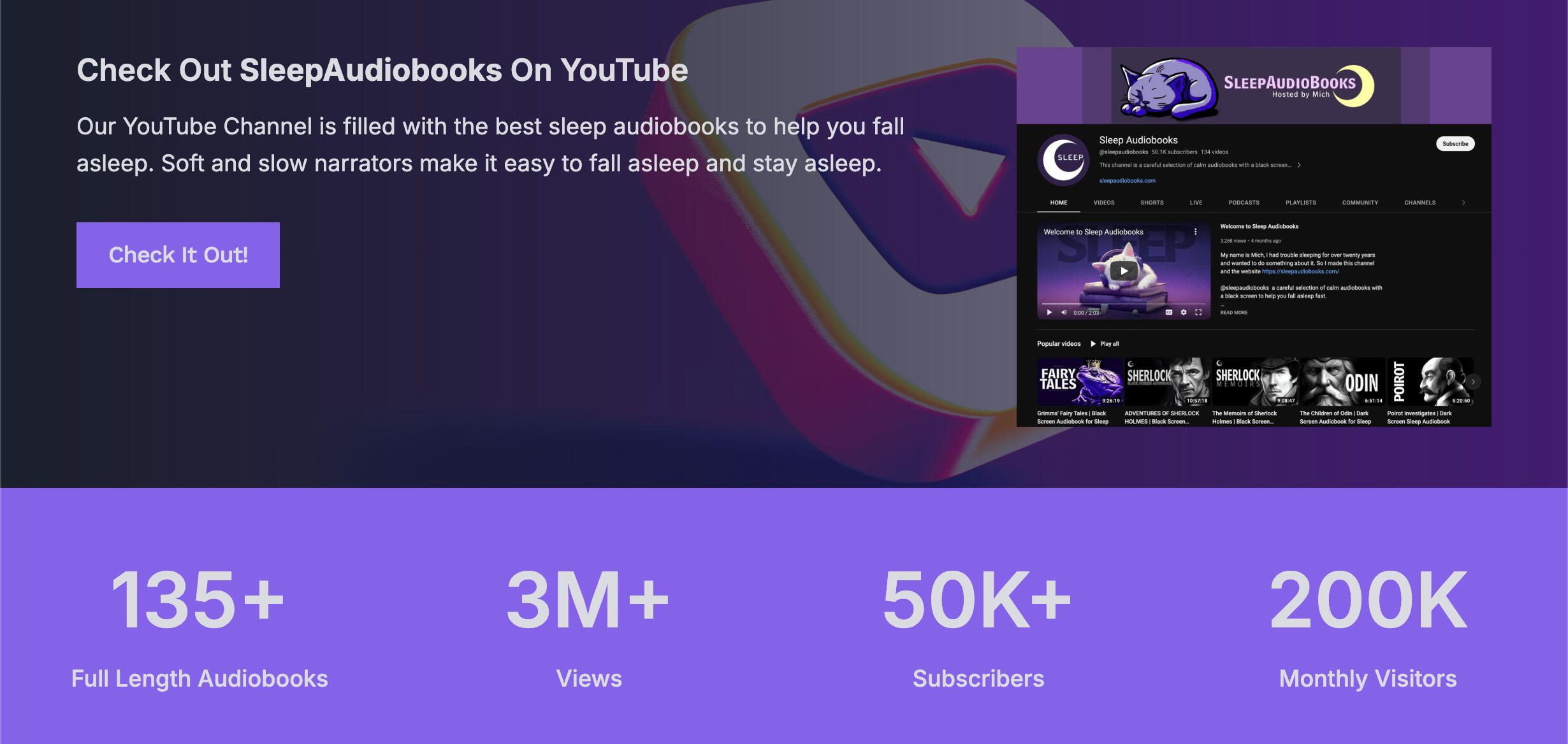 SleepAudiobooks is a long-form content channel built from scratch, growing to over 80,000 subscribers and 100,000 active monthly viewers over three years.Starting with a brand identity, website, and content strategy developed from the ground up, the channel was sustained through a research-driven approach that prioritized audience retention over trending short-form content.To scale production, a team of four content creators was hired, trained, and managed simultaneously — with quality control, skills development, and creative flexibility at the center of the process.Analytics were used consistently to inform content decisions and keep engagement steady across YouTube, the website, and a companion blog at SleepAudiobooks.com.